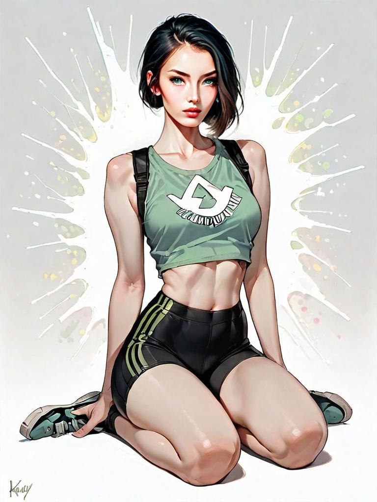 This digital artwork features a realistic full-body portrait of an athletic woman kneeling confidently, showcasing her toned physique. The illustration combines comic-style line work with detailed shading and vibrant colors, highlighting her cropped workout top and sporty shorts against a dynamic splash background. The style emphasizes strong anatomy and modern fitness fashion.