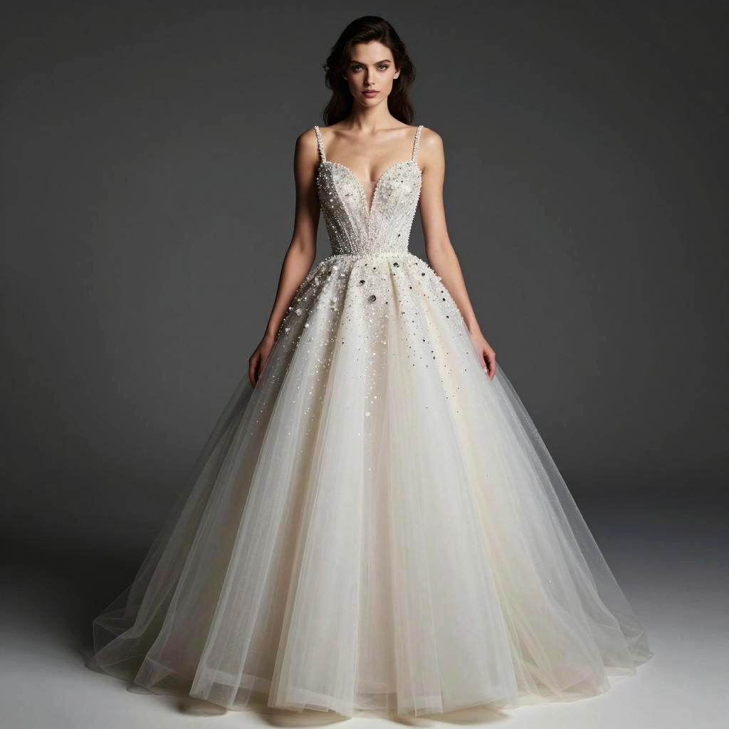 A young woman models an elegant, voluminous ball gown dress with a fitted, bejeweled bodice and delicate thin straps. The gown features intricate embellishments of pearls and crystals that cascade down the skirt, creating a luxurious sparkle effect against a soft tulle fabric, set against a dark neutral background highlighting the dress's details.
