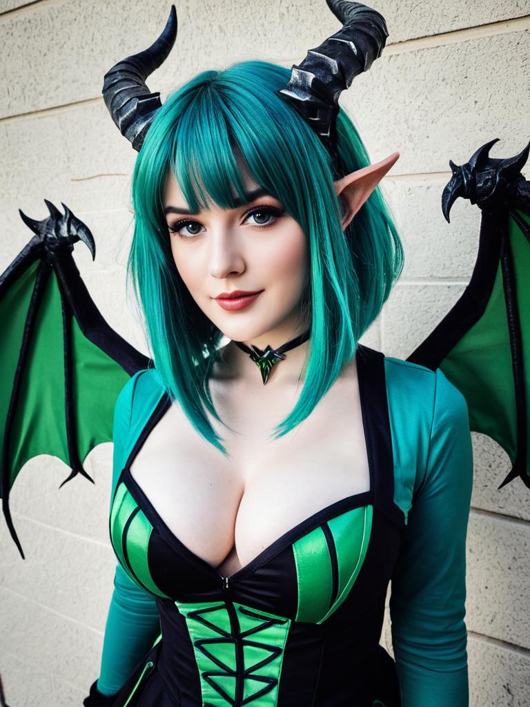 A woman dressed as Apricot the Lich, featuring vibrant teal hair, pointed elf-like ears, and black horns. She is wearing a striking green and black fantasy costume with matching bat-like wings, captured in a sharp, realistic photography style against a neutral background.
