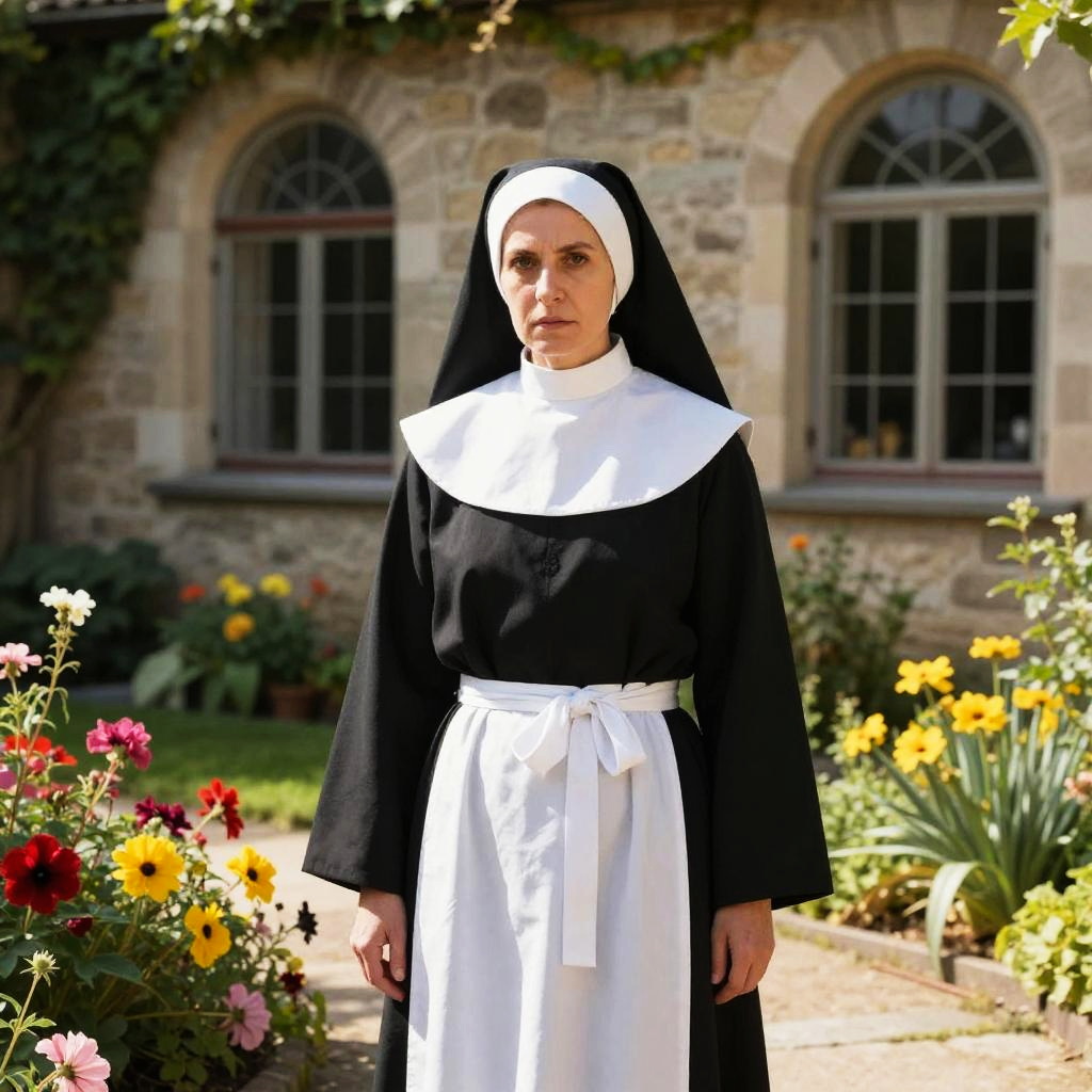 A serious woman dressed in a traditional black and white nun's habit stands outdoors in a well-kept garden with blooming flowers and a stone building in the background. The image reflects a classic religious attire style, highlighting solemnity and devotion in a serene courtyard setting.
