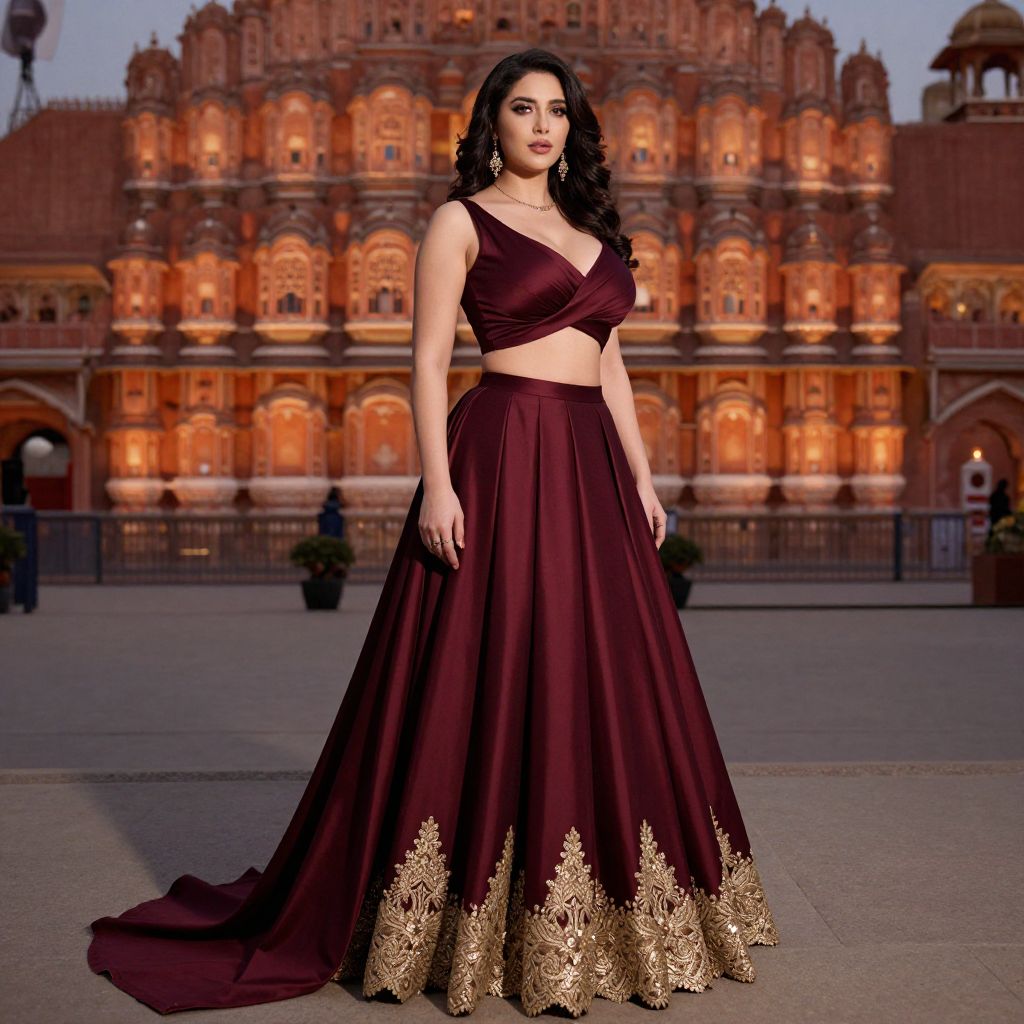 A woman poses elegantly in front of an ornately lit historic architectural backdrop, wearing a deep maroon lehenga with intricate gold embroidery along the hem. The traditional Indian outfit features a stylish cropped blouse with a wrap design, combining modern fashion with classic cultural elements.