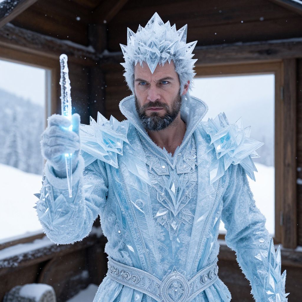 A man dressed as an Ice King stands in a snowy cabin, wearing an intricately detailed frost-covered costume with sharp crystal-like spikes on his shoulders and crown. He holds a glowing icicle-shaped staff, exuding a powerful and regal presence amid a wintry landscape.