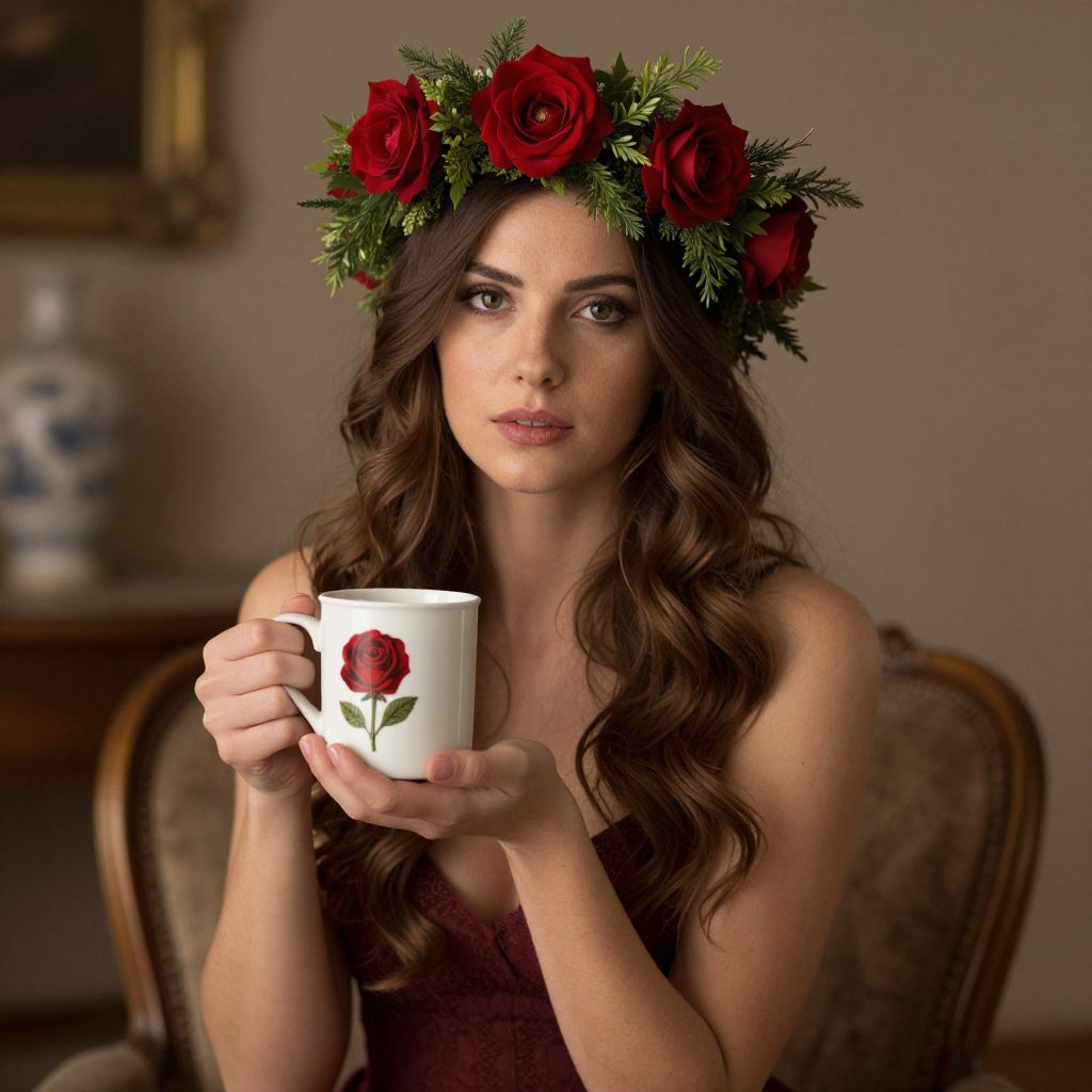 A woman with long, wavy brown hair wears a crown made of red roses and greenery as she holds a white mug adorned with a matching red rose design. The image captures a serene and elegant moment with warm, soft lighting and a vintage-inspired indoor setting.