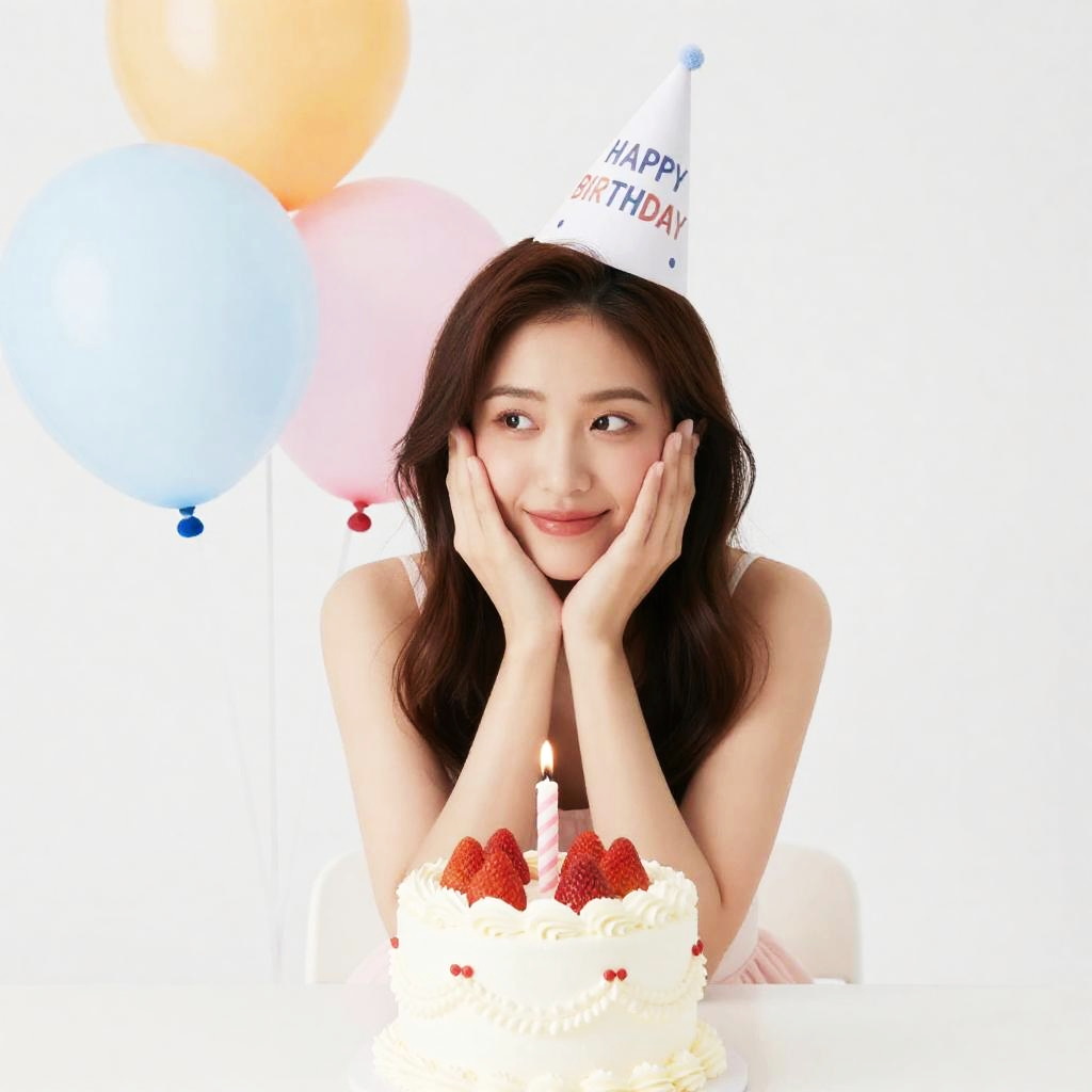 A young woman wearing a festive party hat celebrates her birthday with a beautifully decorated strawberry cake topped with a single lit candle. Colorful balloons in soft pastel shades add to the joyful and lighthearted party atmosphere.