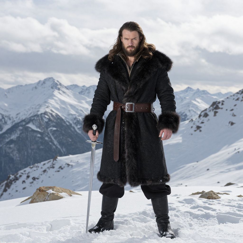 A man dressed in medieval-style winter clothing stands confidently on a snow-covered mountain with a sword planted in the snow. His black fur-trimmed coat and rugged appearance evoke a fantasy warrior or Viking look, set against a dramatic backdrop of snowy peaks under a cloudy sky.