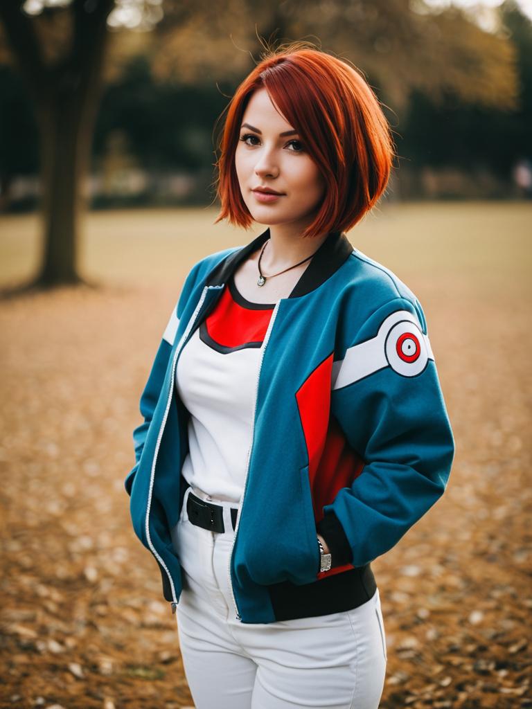 A young woman with vibrant red hair stands outdoors in an autumn setting, wearing a stylish jacket inspired by Pokémon design elements. Her confident expression and casual pose are complemented by a blurred natural background of trees and fallen leaves, creating a warm and inviting portrait.