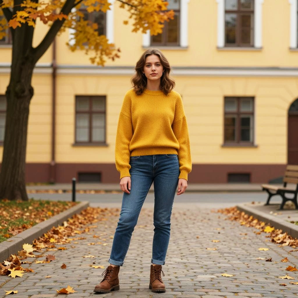 A young woman stands outdoors on a cobblestone pathway surrounded by autumn leaves, wearing a mustard yellow sweater, blue jeans, and brown ankle boots. The soft natural lighting and warm tones of the fall foliage complement her casual yet stylish outfit, capturing a relaxed autumn vibe.