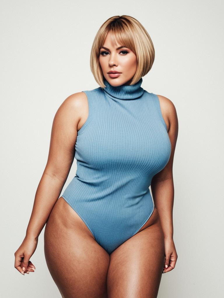 A confident woman poses against a plain background wearing a fitted, sleeveless, light blue ribbed bodysuit with a turtleneck. The modern portrait highlights her poised expression and stylish short blonde bob haircut, emphasizing body positivity and contemporary fashion.