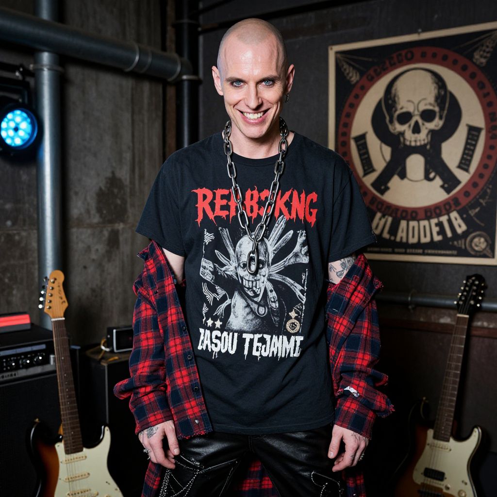 A bald man with striking blue eyes is dressed in a black graphic t-shirt featuring red and white print, paired with a red plaid shirt worn loosely over it. He accessorizes with a large chain necklace and leather pants, standing confidently in a music-themed room with guitars and skull-themed posters in the background, conveying a bold punk rock or alternative style.
