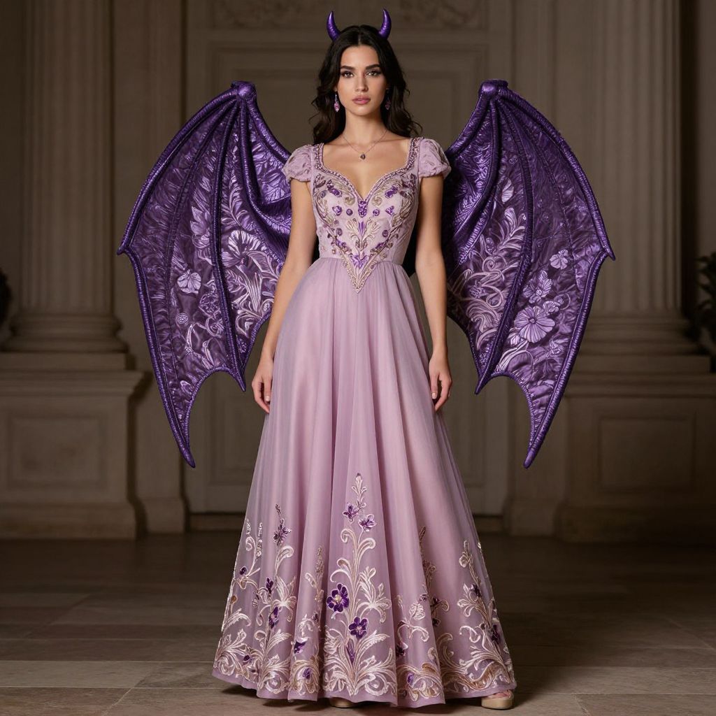 Elegant Woman in Lilac Embroidered Gown with Purple Dragon Wings Fantasy Costume