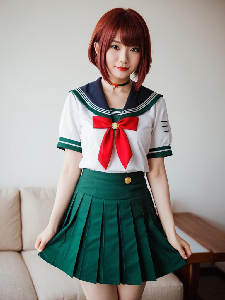 A young woman poses indoors wearing a classic Japanese sailor school uniform featuring a white blouse with green trim and a prominent red bow, paired with a green pleated skirt. The image captures a clean, realistic photographic style with soft lighting, highlighting the vibrant colors and textures of the outfit.