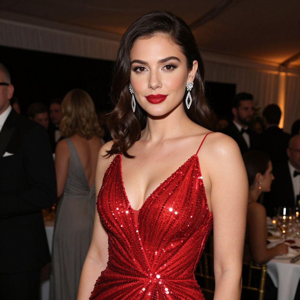 A woman dressed in a stunning red sequin gown poses elegantly at a formal event. Her flawlessly styled dark hair, sparkling earrings, and bold red lipstick complement the glamorous atmosphere of the high-end gathering.