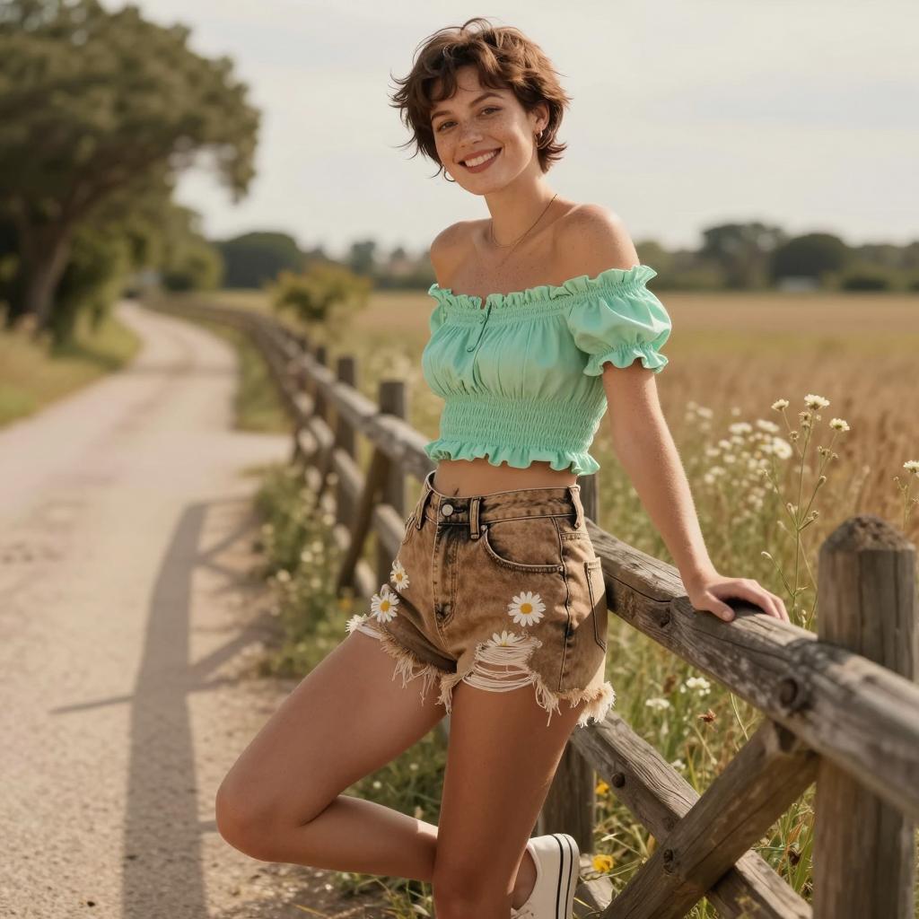 A young woman with short curly hair smiles confidently while leaning against a wooden fence along a rural path on a sunny day. She wears a mint green off-the-shoulder crop top paired with distressed denim shorts featuring daisy prints, embodying a casual and trendy Gen Z fashion style.
