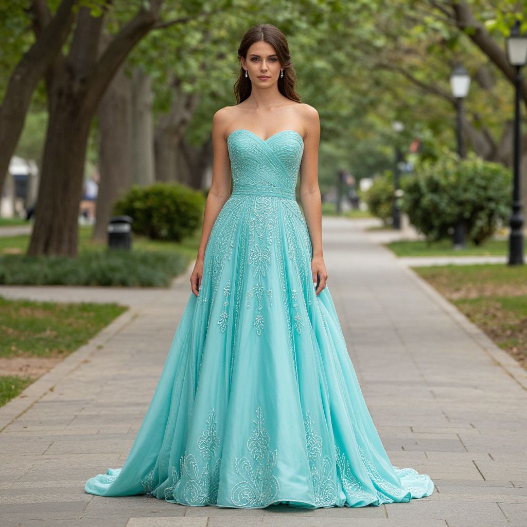 Elegant Aqua Blue Strapless Evening Gown on Woman in Park