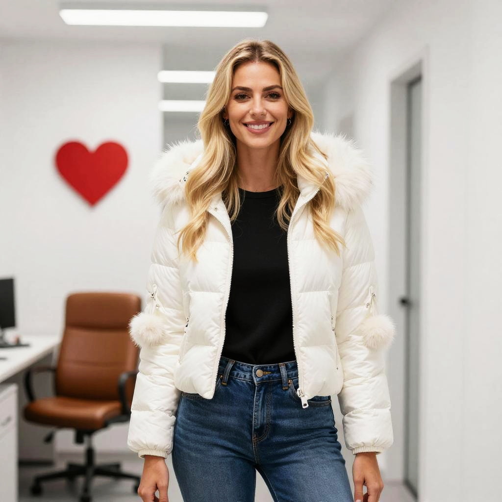 A smiling woman stands confidently in a modern office setting, dressed in a stylish white puffer jacket with fur details and blue jeans. The background features a cozy workspace with a brown office chair and a red heart decoration on the wall, adding a warm and inviting atmosphere.