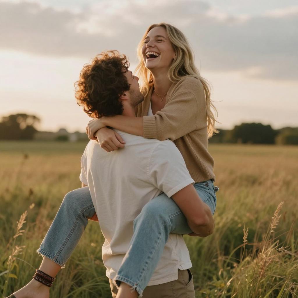 A joyful young couple shares a tender moment in a grassy field during golden hour. The man lifts the woman, who laughs with delight, capturing the warmth and carefree spirit of their connection in a natural outdoor setting.