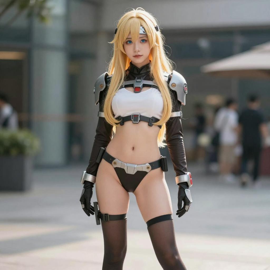 A young woman in an intricately designed futuristic cosplay outfit poses outdoors, combining sci-fi armor elements with a sleek, modern aesthetic. Her long blonde hair and striking blue eyes complement the high-tech details of her costume, which includes metallic shoulder pads, gloves, and thigh straps, perfectly embodying a Gen Z-inspired cyber warrior style.