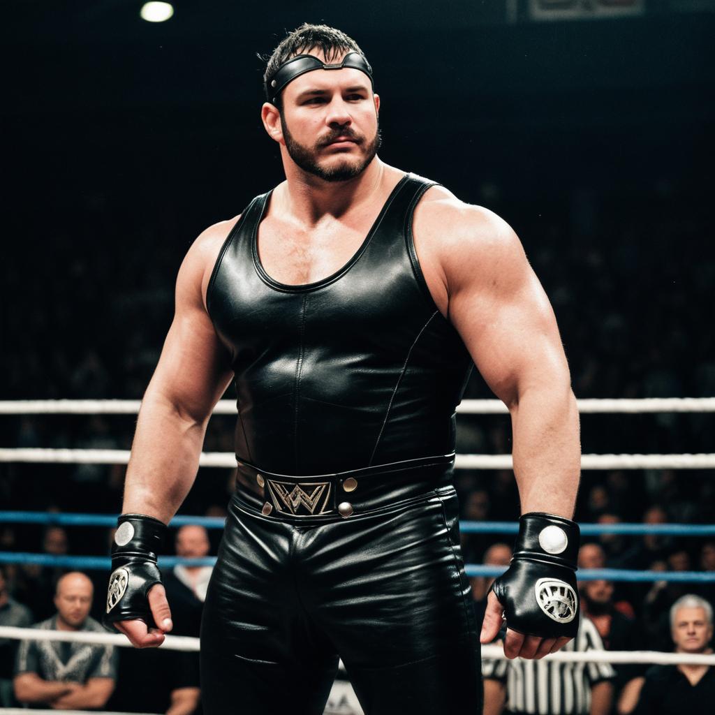 A muscular male wrestler stands confidently in a wrestling ring wearing a black leather outfit, complete with a tank top, pants, and fingerless gloves. His intense expression and strong build emphasize his readiness for competition, highlighted by the dramatic lighting and blurred audience in the background.