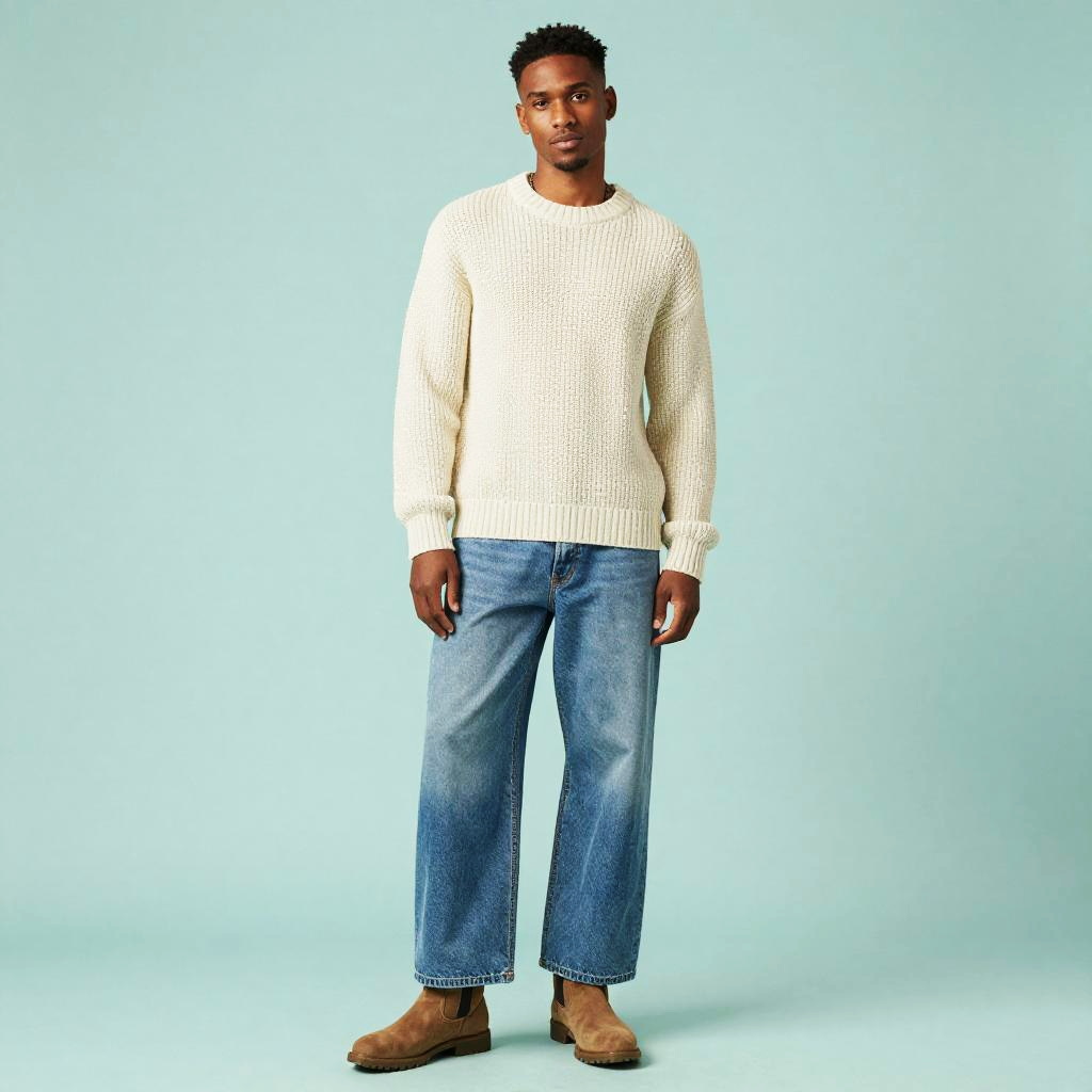 A young man models a casual Gen Z outfit consisting of a chunky cream knit sweater, wide-leg blue jeans, and brown suede boots against a solid pastel background. The relaxed fit and soft earthy tones capture a contemporary yet timeless streetwear style favored by the younger generation.