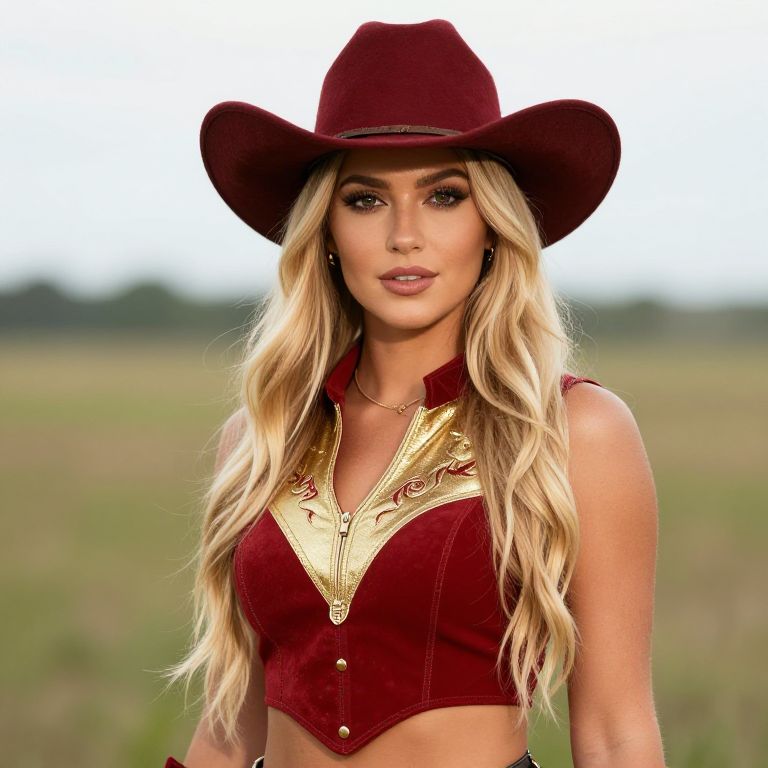 A confident young woman stands outdoors wearing a stylish maroon cowboy hat and a matching western-inspired sleeveless top adorned with gold accents. Her long blonde hair cascades over her shoulders, complementing the rustic and elegant western aesthetic in a natural, open field setting.