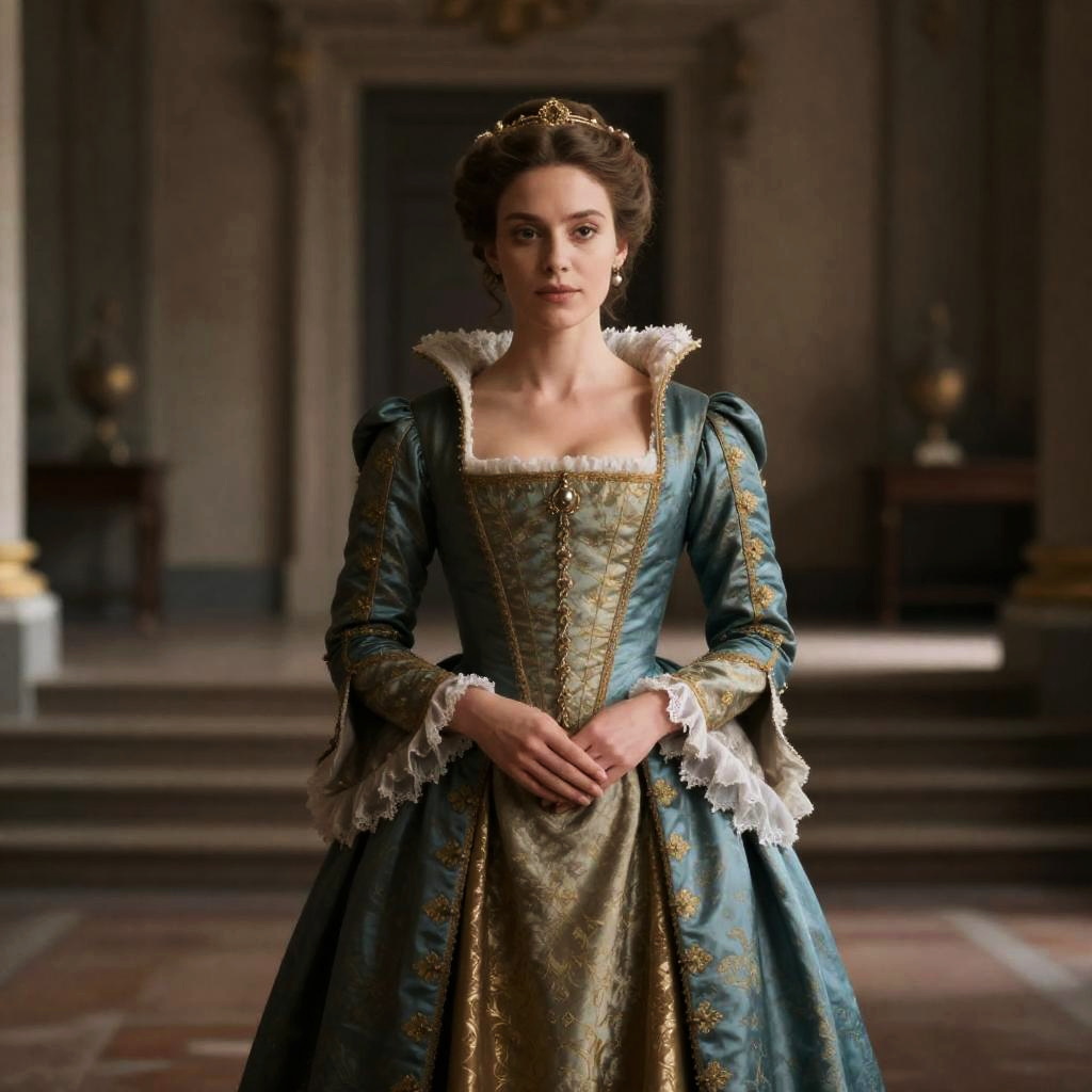 A woman stands poised in an opulent Renaissance-style dress featuring intricate gold embroidery and luxurious fabrics. The detailed costume, complete with lace cuffs and a delicate tiara, evokes the elegance of iconic movie period costumes set in grand historical interiors.