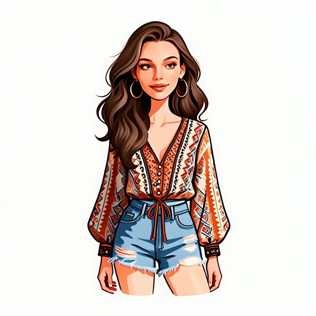 This digital illustration features a stylish woman with flowing, wavy brown hair and hoop earrings, wearing a bohemian patterned blouse paired with distressed denim shorts. The artwork highlights her confident and cheerful expression, blending modern fashion with boho-chic elements in a vibrant and detailed style.
