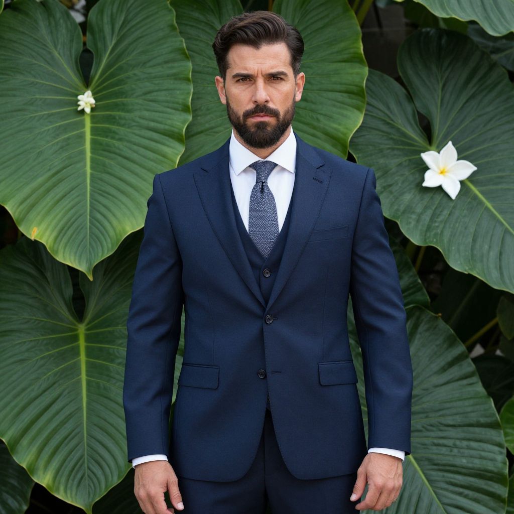 A confident man in a sharp navy blue suit stands against a backdrop of large tropical green leaves adorned with white flowers. His well-groomed beard and serious expression complement the formal business attire, blending nature with elegance in this striking portrait.
