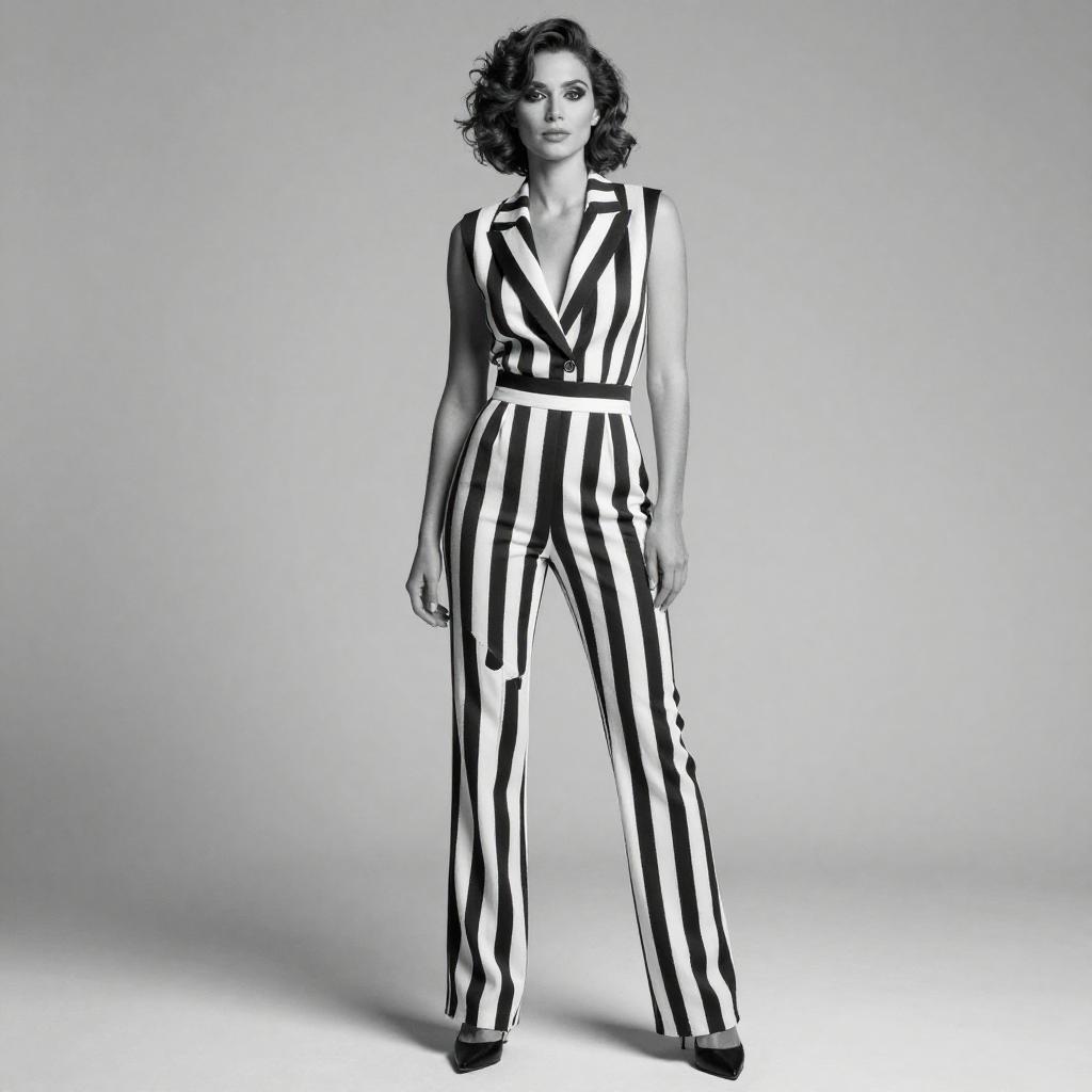A confident woman poses in a stylish black and white vertical striped jumpsuit, embodying a bold and modern fashion statement. The monochrome palette and sharp tailoring enhance the retro-inspired look, complemented by her vintage curls and poised stance.