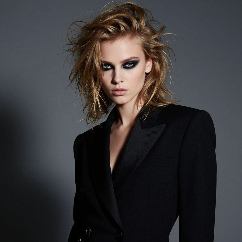 A striking portrait of a woman with tousled blonde hair and dramatic smoky eye makeup, dressed in a sophisticated black blazer. The dark, moody background enhances the edgy and high-fashion vibe of the image.