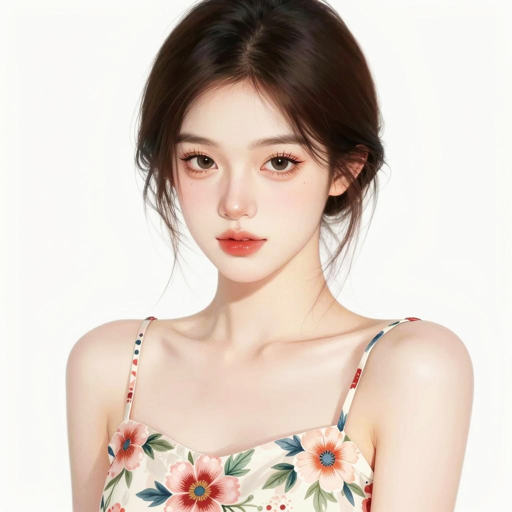 A beautifully detailed digital portrait of a young woman with delicate features and a soft expression, wearing a floral patterned dress. The image showcases a realistic yet slightly stylized art style, emphasizing smooth skin tones, large expressive eyes, and subtle makeup. This Gen Z-inspired artwork captures a fresh and modern aesthetic with a clean white background.