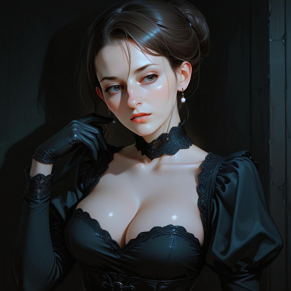 This digital artwork features a woman dressed in an elegant and dark gothic style outfit with a glossy black corset and long gloves, highlighting a striking blend of chiaroscuro lighting. The highly detailed illustration captures a moody, illustrious atmosphere with a focus on realistic textures and lifelike facial expression.
