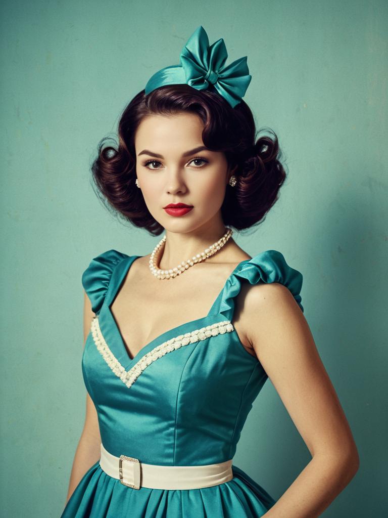 A woman dressed in a retro party dress exudes vintage elegance with her 1950s-inspired hairstyle and makeup. Her teal satin dress, adorned with ruffled sleeves, a white belt, and a matching large bow headpiece, complements her classic pearl necklace and earrings, capturing the essence of mid-century fashion.
