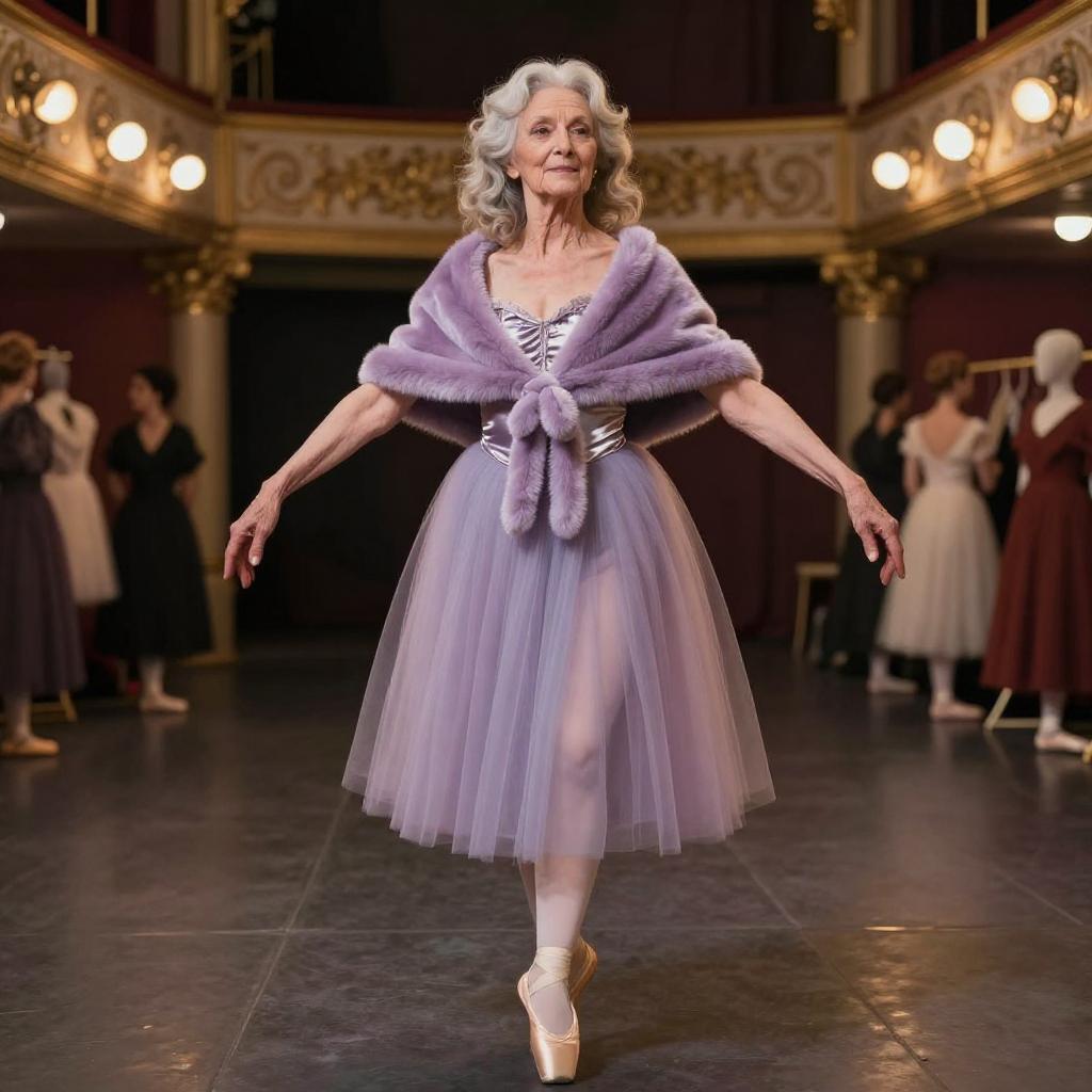 An elegant elderly woman gracefully poses in a classic lavender ballet costume with a tulle skirt and a matching fur stole, set against the backdrop of a vintage theater dressing room. The scene captures the timeless beauty and poise of ballet, highlighting her confident stance on pointe shoes in a richly detailed, ornately decorated environment.