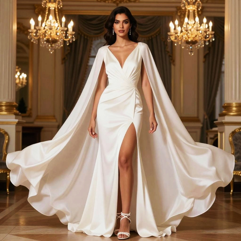 A glamorous woman stands poised in an elegant white satin gown featuring a deep V-neckline and a dramatic thigh-high slit. The dress is accentuated by flowing cape-like sleeves, set against an opulent ballroom backdrop with golden chandeliers and classic decor.