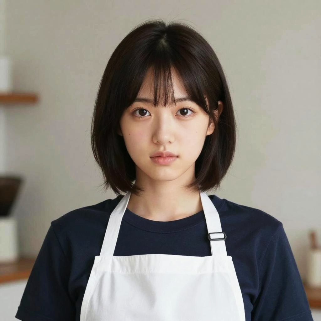 A young woman with short dark hair and bangs wears a white apron over a navy blue shirt, standing in a softly lit indoor setting. Her calm and focused expression highlights a natural, minimalist style, representing a Gen Z portrait often captured in contemporary lifestyle photography.