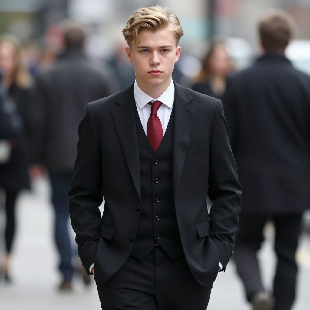 A young man dressed in a sharp black three-piece suit with a white shirt and red tie confidently walks down a busy urban street. The background is softly blurred, placing full emphasis on his focused expression and smart attire, capturing a modern professional or business style.