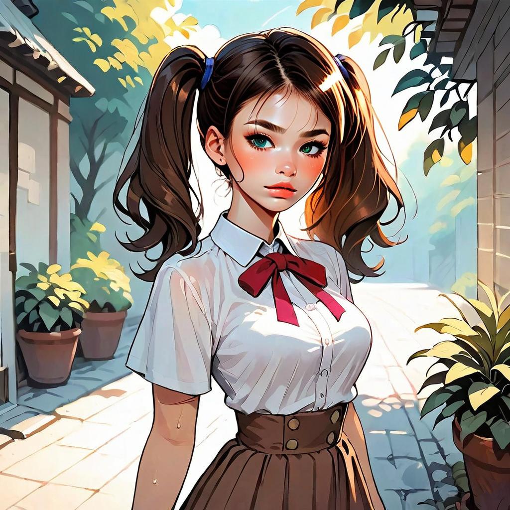 A digitally illustrated young woman with striking blue eyes and long brown hair styled in twin ponytails stands in a sunlit alley. She wears a school uniform with a white blouse, red bow tie, and brown pleated skirt, set against a backdrop of potted plants and traditional architecture in a vibrant anime style.