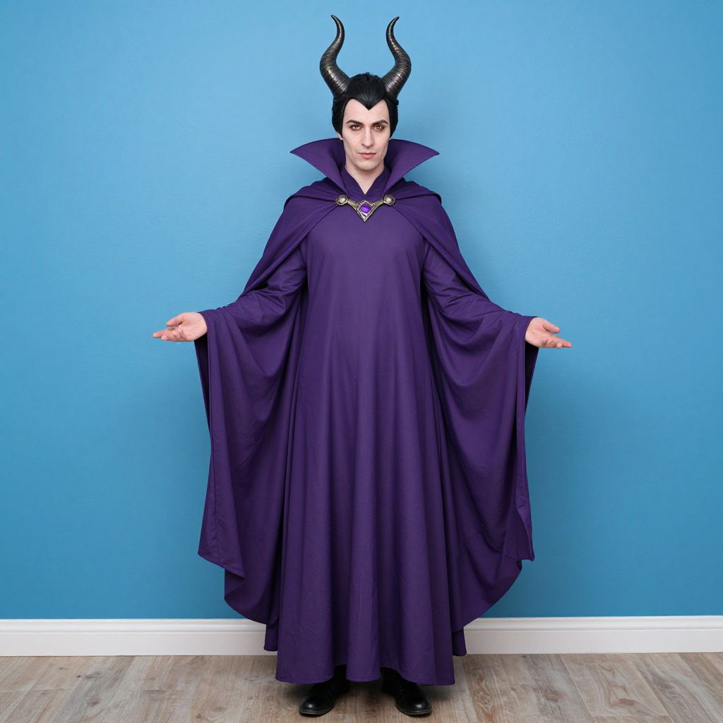 Man in Maleficent-Inspired Costume with Horns and Purple Cape