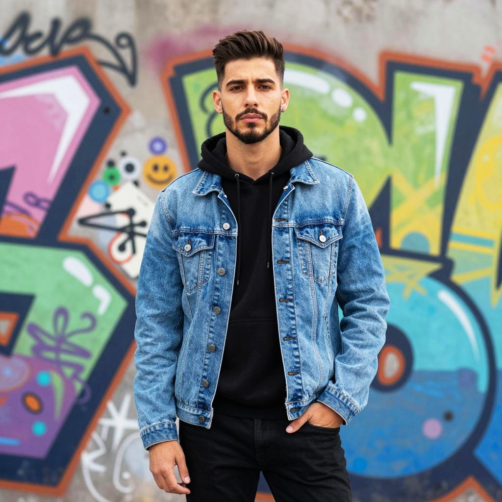 Young Man in Denim Jacket with Urban Graffiti Background
