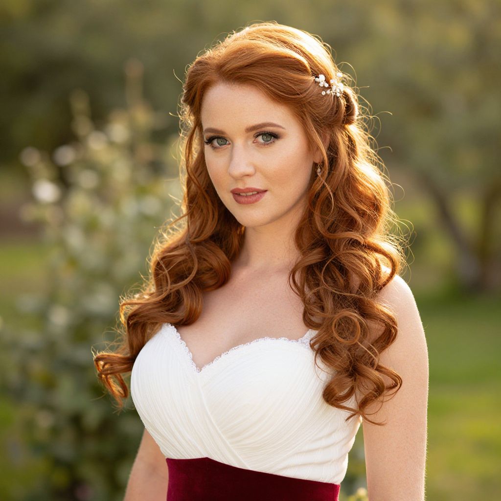 A beautiful red-haired woman poses outdoors in natural light, wearing a white and burgundy dress with a delicate hair accessory. The warm tones and soft focus background create a romantic and elegant atmosphere.