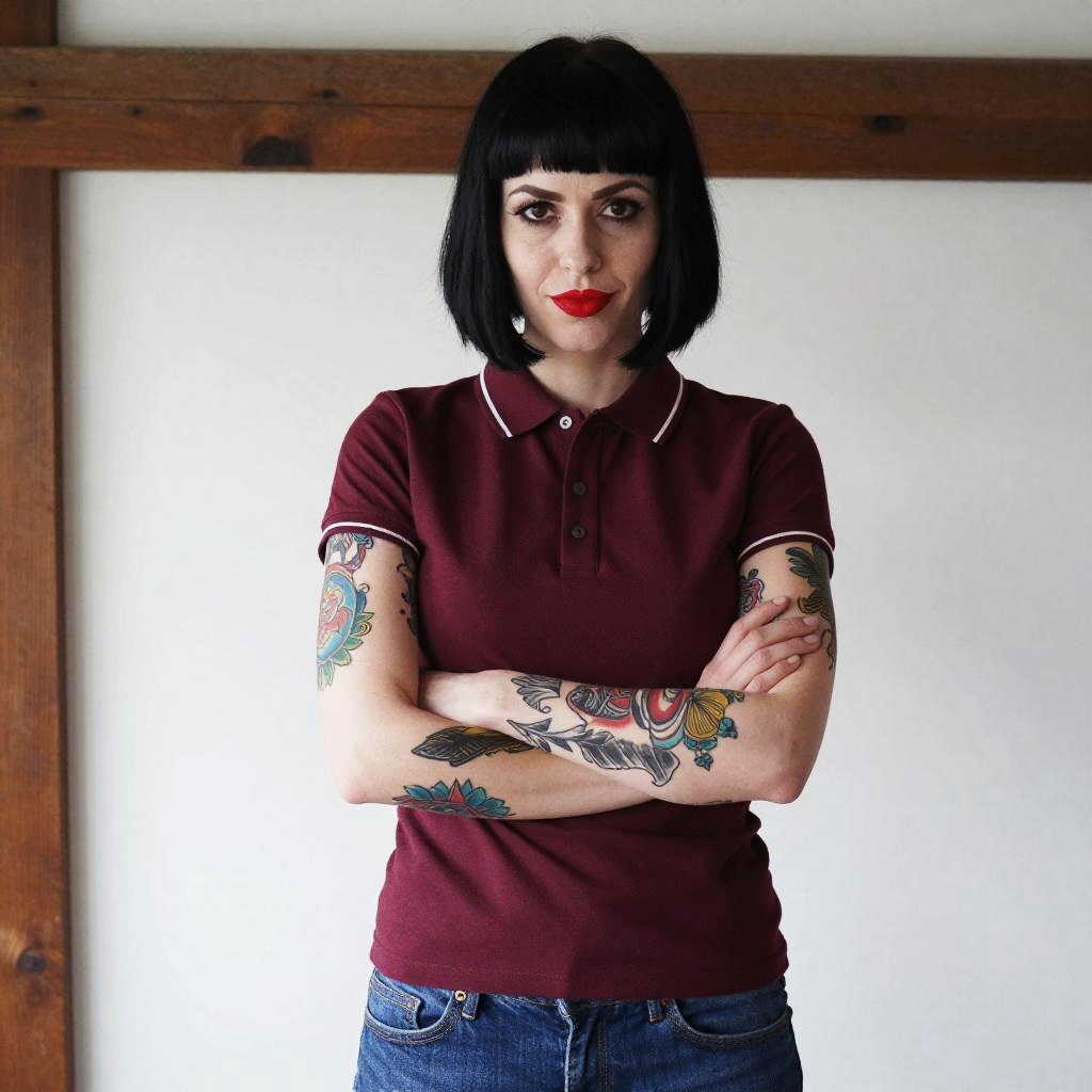 A confident woman with striking black bob haircut and bright red lipstick stands with her arms crossed, showcasing colorful tattoos on both arms. She is wearing a fitted maroon polo shirt and blue jeans, set against a simple neutral background with wooden trim.