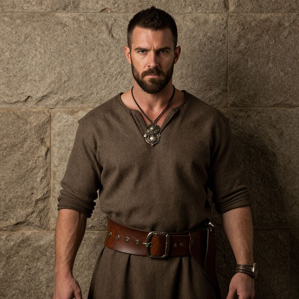 A serious-looking man dressed in a medieval or Viking-inspired outfit stands against a stone wall background. He wears a brown tunic with rolled-up sleeves, a wide leather belt with metal studs, and a distinctive pendant necklace, embodying a strong, historical warrior style.
