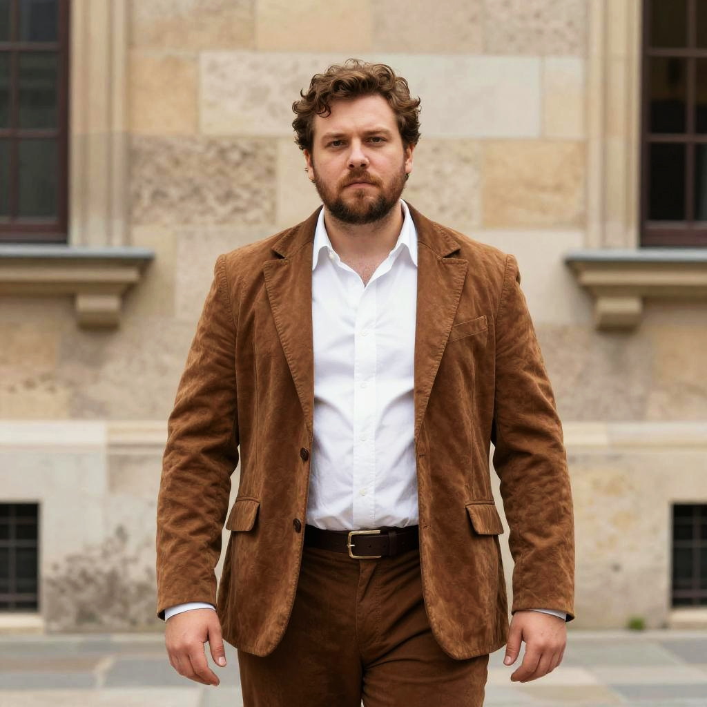 A plus-size man poses confidently in a Renaissance-inspired costume, featuring a brown suede jacket and matching pants paired with a classic white shirt. The outfit combines historical style with a modern twist, set against a stone building backdrop that complements the vintage aesthetic.