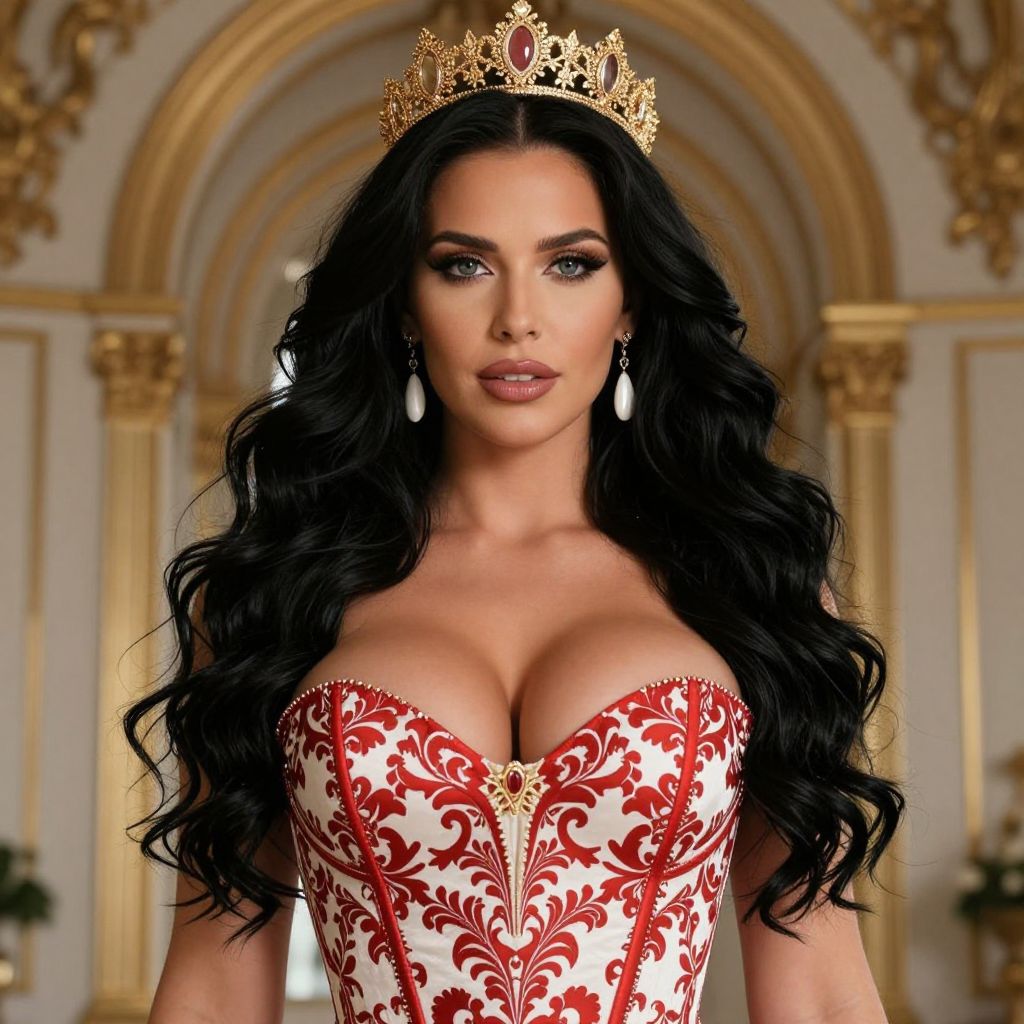 A glamorous woman with long black wavy hair wears a golden ornate crown and elegant pearl drop earrings. She is dressed in a striking red and white corset featuring intricate baroque patterns, standing against a luxurious backdrop with golden architectural details, evoking a regal and sophisticated atmosphere.
