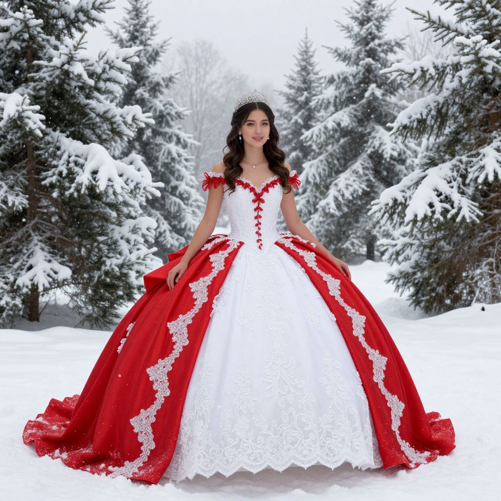 A young woman stands gracefully in a snowy forest wearing an elegant ball gown with a striking red and white color scheme. Her dress features intricate lace details and a voluminous skirt, complemented by a delicate tiara, evoking a regal and fairy-tale-like winter scene.