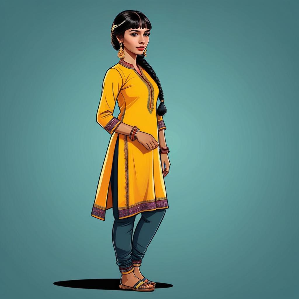 This digital illustration features a young woman dressed in a traditional South Asian outfit, consisting of a yellow kurti with intricate border detailing and blue churidar pants. The artwork showcases a modern vector art style with clean lines and vibrant colors, highlighting the woman's braided hairstyle and gold jewelry against a soft teal background.