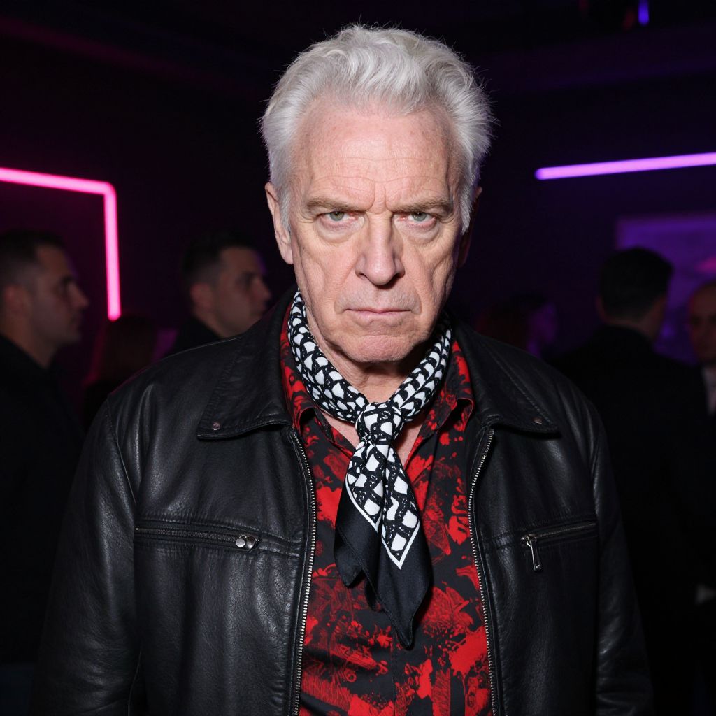 An older man with striking white hair and a serious expression stands confidently in a dimly lit environment with vibrant neon lights in the background. He is dressed in a red patterned shirt, black leather jacket, and a black and white patterned scarf, embodying a classic rock or biker style.