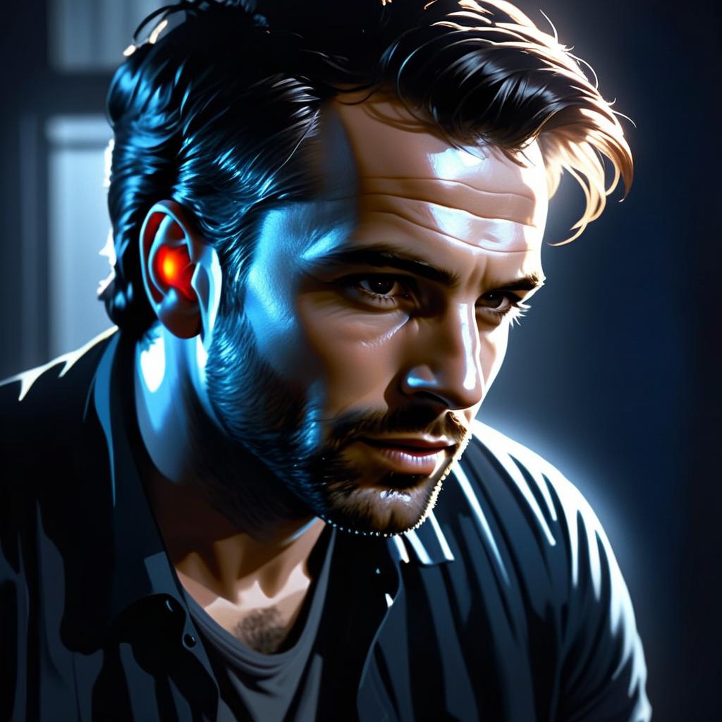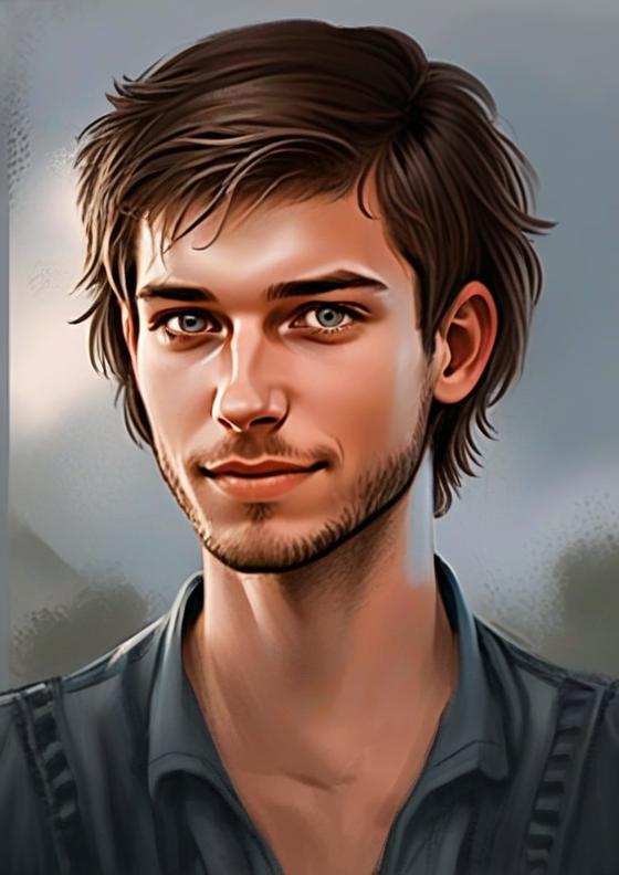 A striking portrait of a man with tousled hair and piercing blue eyes, dressed in a fashionable black leather jacket adorned with a unique fur collar. The warm background enhances the vibrant colors of the image, highlighting the subject's confident expression and contemporary style.