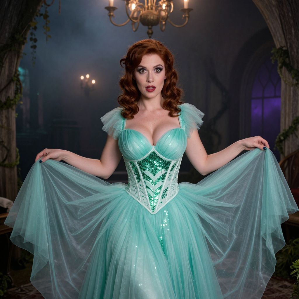 A red-haired woman dressed in an elegant, light turquoise ball gown with a sequined corset bodice stands in a dramatic, dimly lit setting. The image captures a vintage glamour style with soft tulle fabric and theatrical lighting, creating a fantasy or fairytale atmosphere.