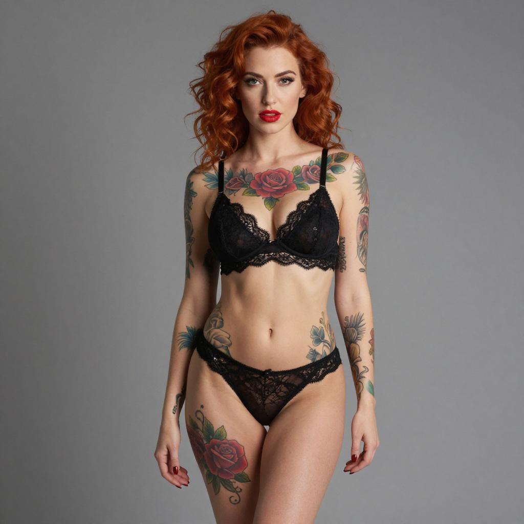 Red-Haired Woman in Black Lace Lingerie with Floral Tattoos Studio Portrait